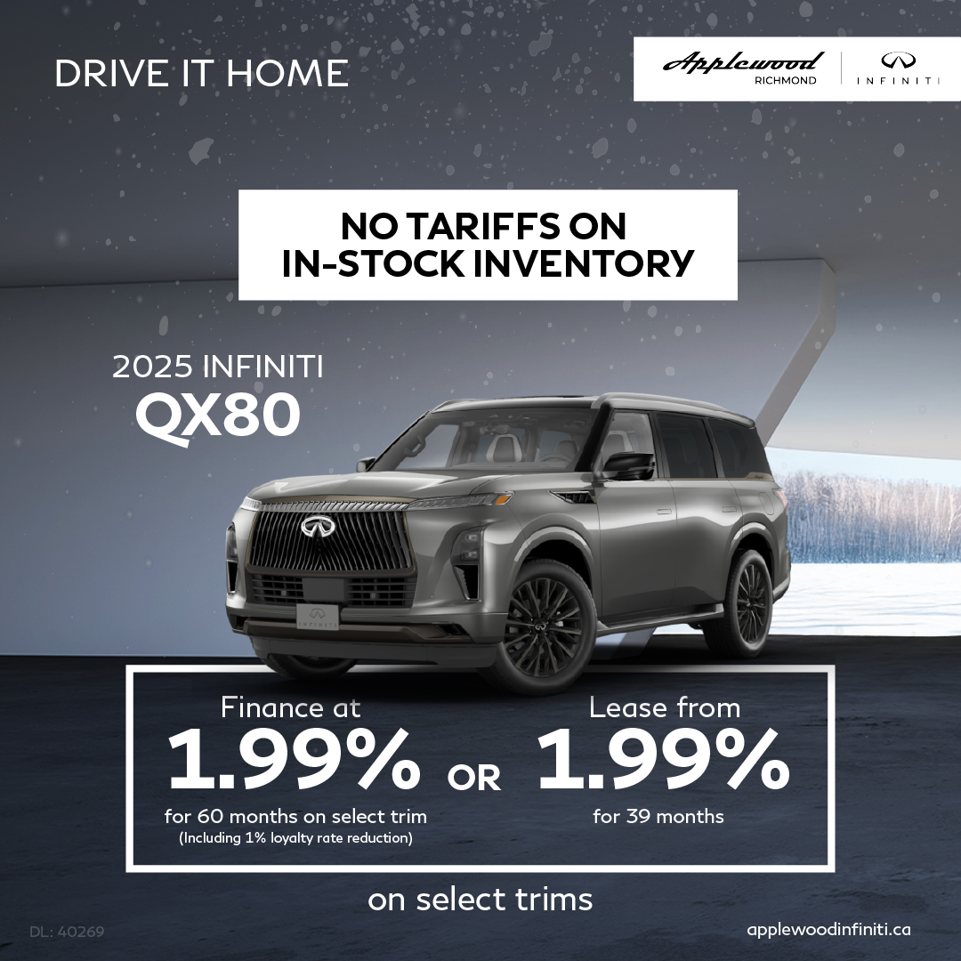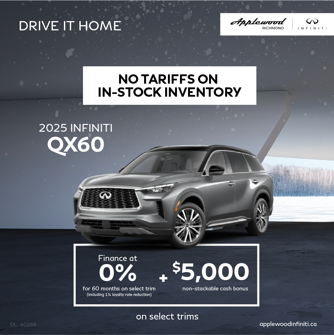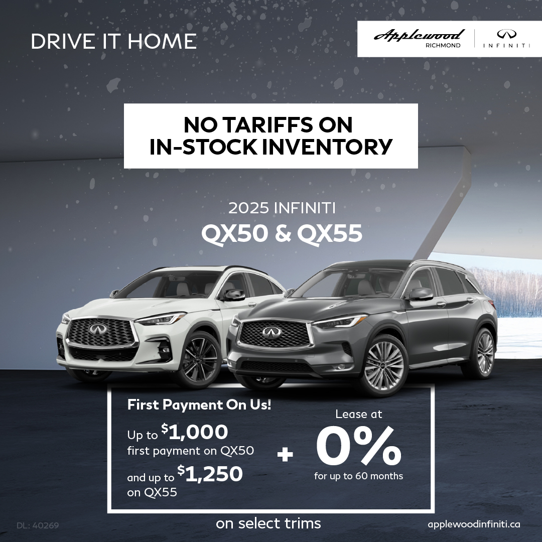 Monthly payment is $ 497 and includes: $ 2495.00 freight and PDI; $ 100.00 A/C charge; regulatory fees of up to $ 0; dealer mandatory charges of up to $ 921.00; lien registration fees (including lien registering agent's fees, where applicable) up to $ 60.0 total;,Total lease obligation is $ 25,648. **First payment waiver applies only to new and previously unregistered 2025 QX50 and QX55 models leased through Infiniti Financial Services (on approved credit) and delivered by January 2, 2026. First payment (including all taxes) will be waived. After the first payment, customer will be required to make all remaining scheduled payments over the remaining term of the contract. Offer available until January 2, 2026. While supplies last. Conditions apply. Offer is subject to change or cancellation without notice. See your participating dealer or visit www.infiniti.ca for details.Offers available until midnight on January 2, 2026. Offers May change without notice. Certain conditions May apply. Retailer May lease for less. Retailer order/trade May be necessary (but May not be available in all cases). See your nearest INFINITI retailer for complete details.